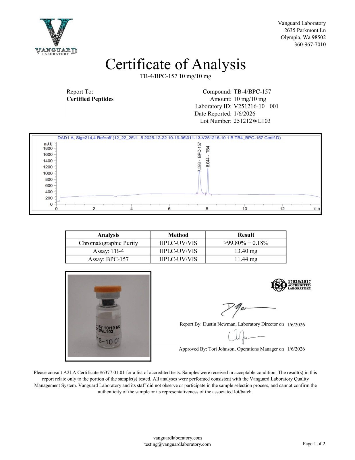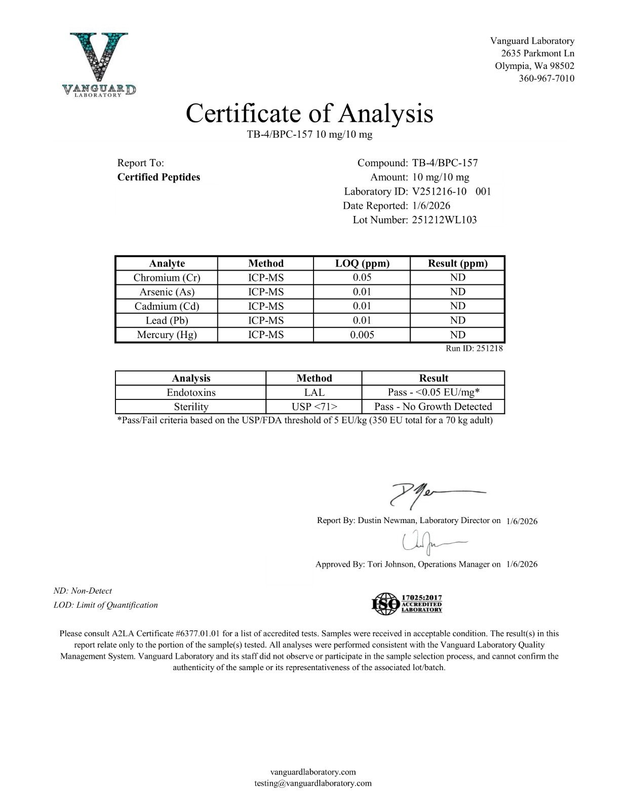 BPC-157/TB-500 Blend is provided strictly for research use only. This product is not intended for human or animal use, clinical purposes, diagnostic work, or consumption. Qualified professionals must conduct all research in proper laboratory environments and in compliance with applicable regulations and guidelines.
